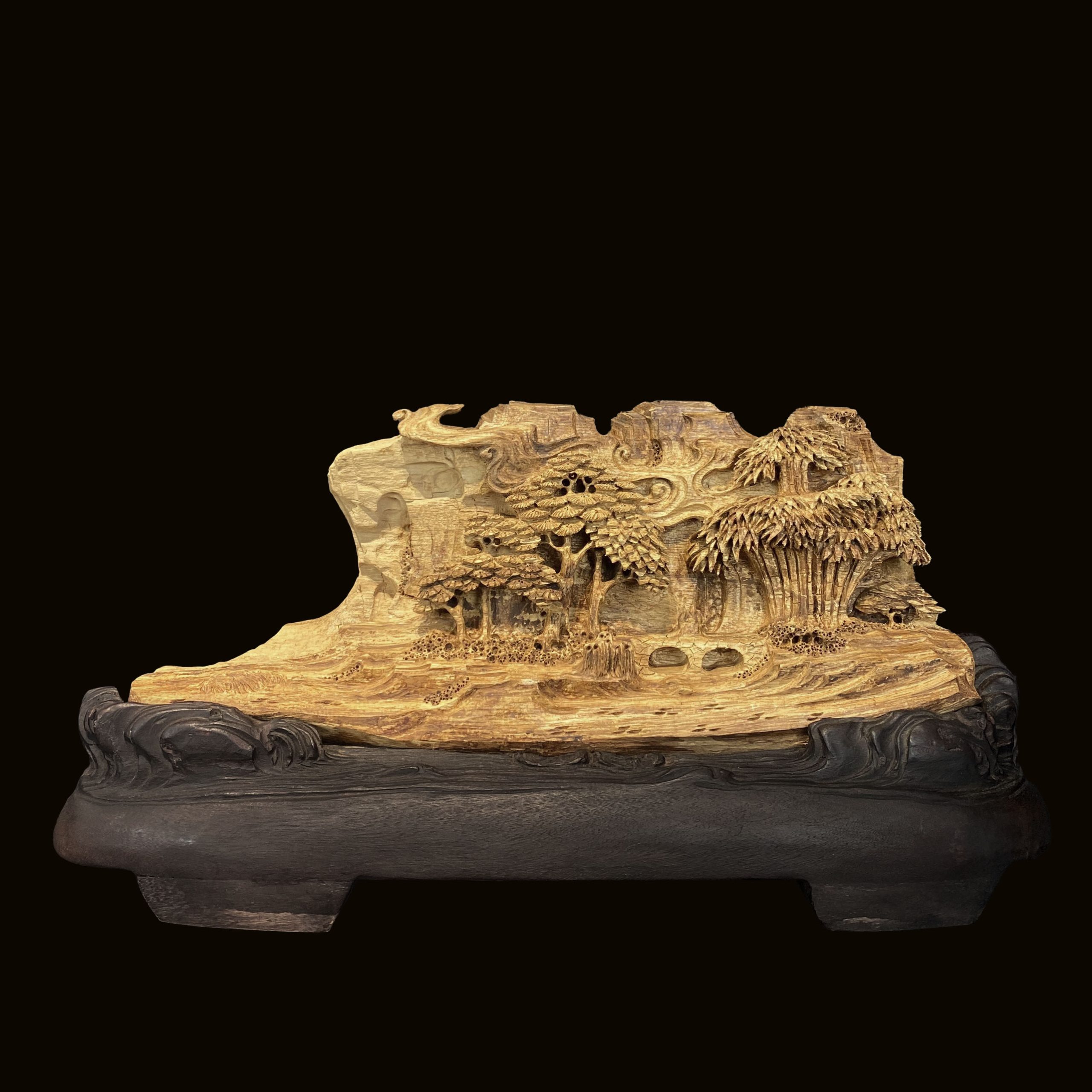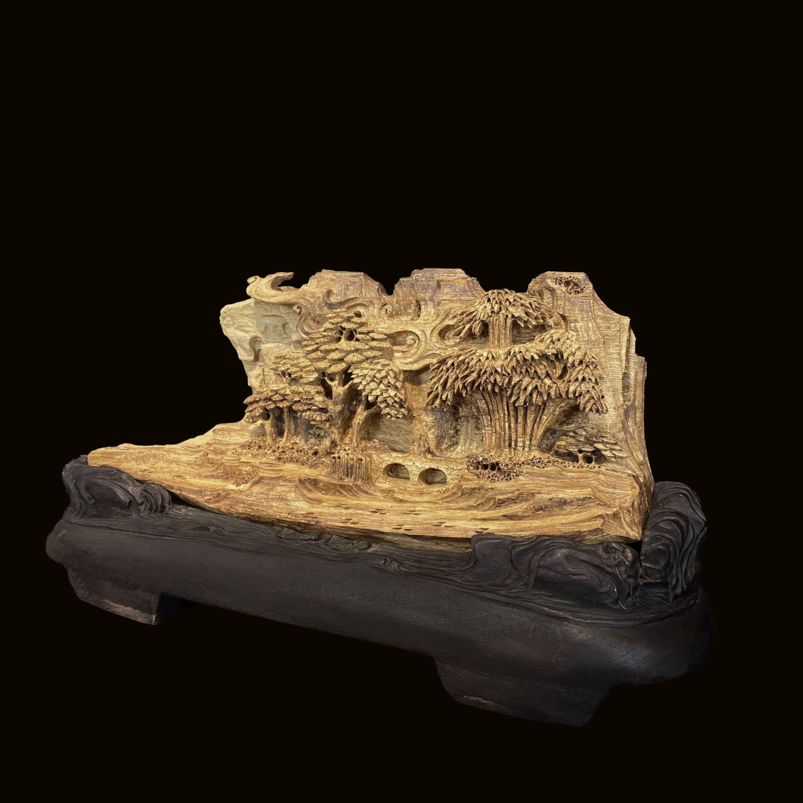 - Đây là tác phẩm trầm hương, mô tả cảnh sơn thuỷ bình yên. Chạm khắc cây Tùng biểu tượng của sự chính trực trường thọ và khí chất hiên ngang của người quân tử, Tre là biểu tượng của sức sống mãnh liệt sự uyển chuyển mềm dẻo nhưng không kém phần vươn thẳng lên.