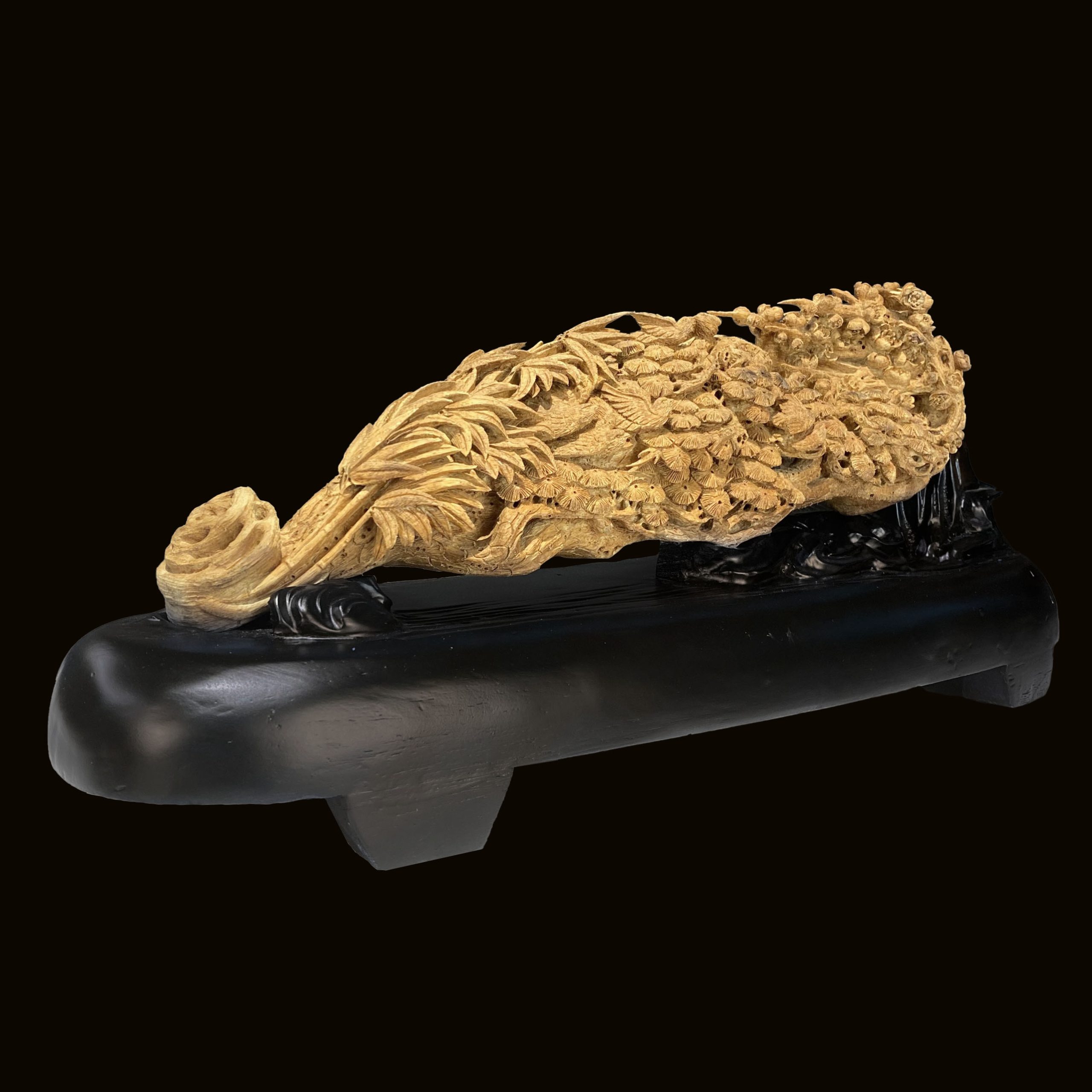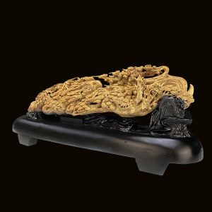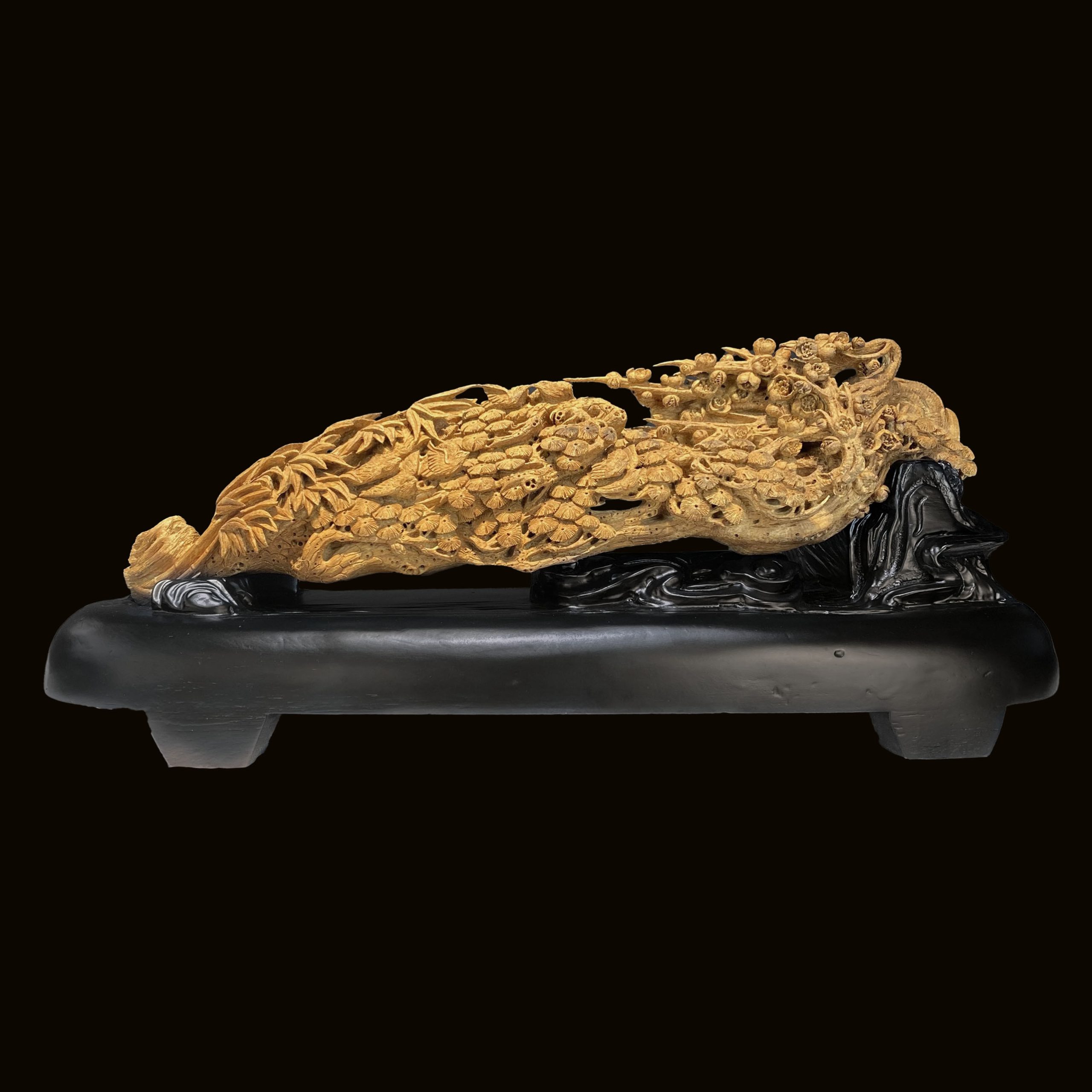 - Đây là tác phẩm trầm hương, mô tả cảnh sơn thuỷ bình yên. Tác phẩm chạm khắc Tùng Trúc Cúc Mai thể hiện sự luân chuyển tự nhiên của đất trời, từ mùa xuân, hạ, thu đến mùa đông. Chính sự luân chuyển này đã giúp vạn vật được sinh sôi nảy nở, đem đến may mắn, hy vọng về cuộc sống suôn sẻ và thịnh vượng.