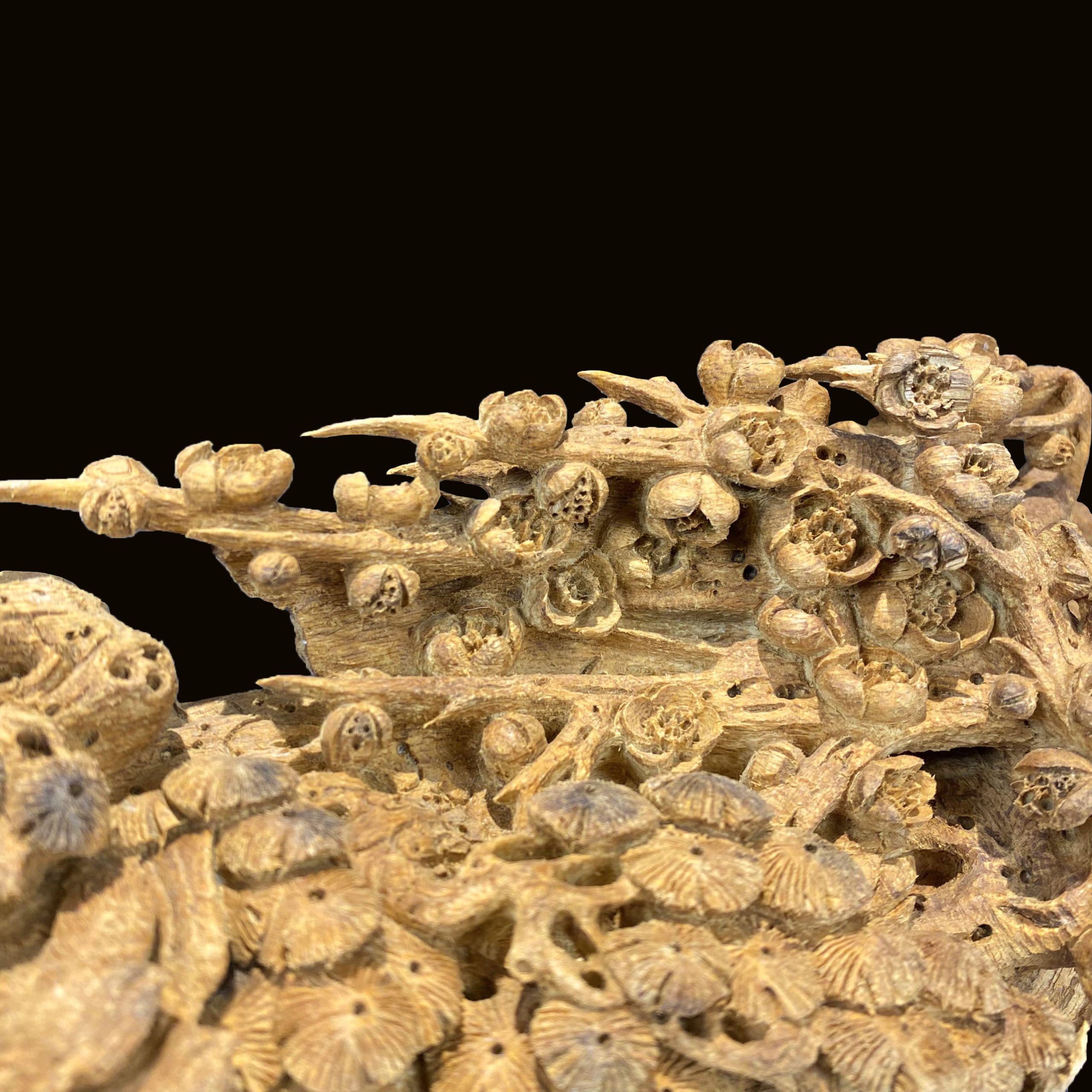 - Chạm khắc cây mai đại diện cho mùa xuân. Đây là loại cây có thân và cành gầy guộc, cánh hoa mỏng manh mang mùi hương dịu dàng, thanh khiết, nhưng bên trong là sức sống mãnh liệt, là cả một sự kiêu dũng. Nhờ sự kiêu dũng này mà hoa mai có thể chịu qua gió tuyết mùa đông để nở bung cánh vào mùa xuân, báo hiệu một năm mới đến, hoa mai biểu tượng cho sự hiển vinh, cao thượng, nụ hoa nẩy lộc đón xuân đem đến tài lộc, tình cảm và sự giàu sang, sung túc.